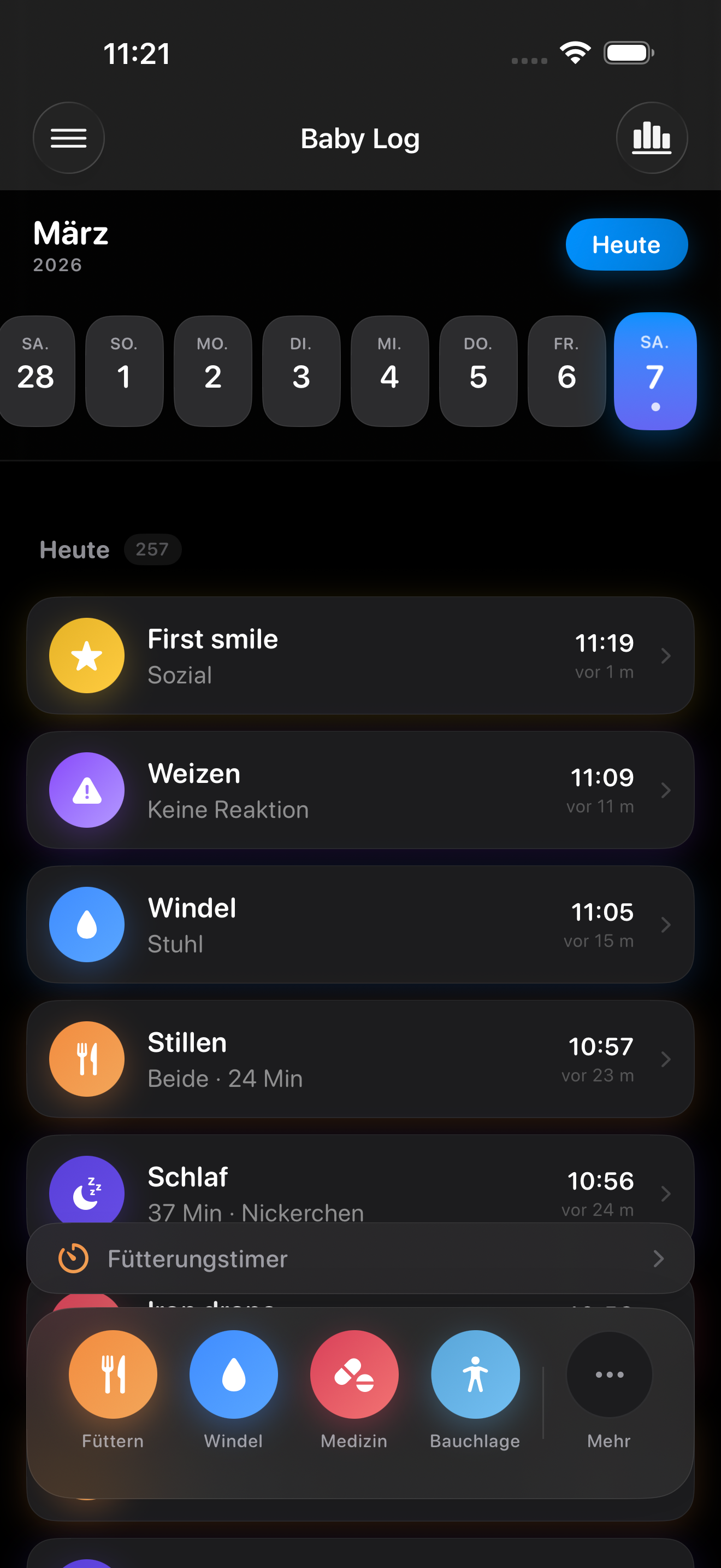 Fütterung, Windeln, Medikamente, Wachstum und Bauchlage verfolgen — ganz ohne Internetverbindung. Ihre Daten bleiben immer auf Ihrem Gerät.