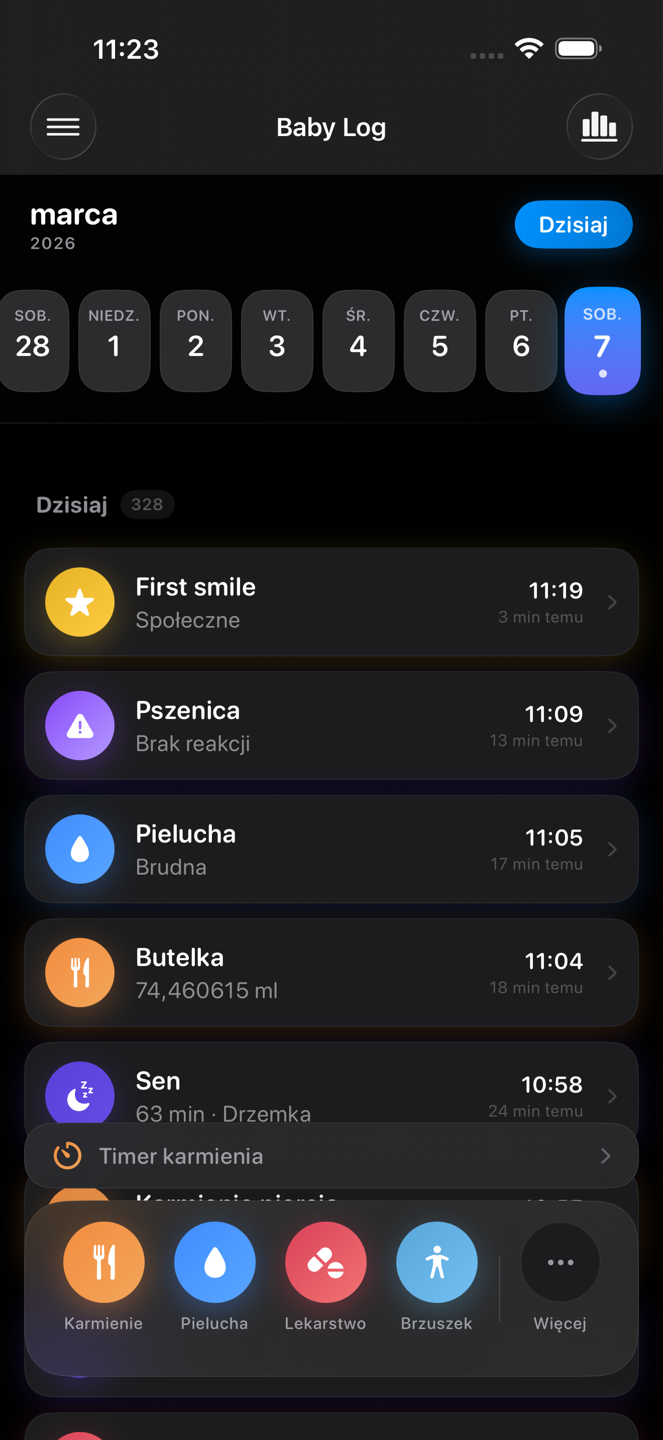 Zapisuj karmienie piersią, butelką i pokarmem stałym. Śledź czas, ilość i stronę.
